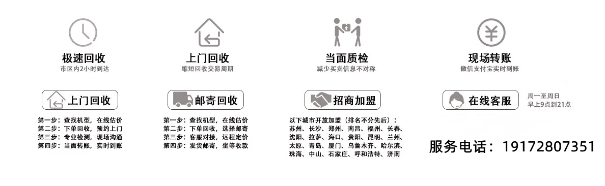 碳枢屿回收专注苹果设备回收,具有完善的产业链,平台一直以客户利益最大化为宗旨,严格遵守规范的、合理的估价流程,为客户提供优质的回收服务。关于价格敏感问题,支持多平台估价方式,以切身行动为客户提供福利。在疫情期间,碳枢屿回收支持北京、上海、深圳、广州、西安、佛山、东莞、苏州、天津等地的上门回收服务,实现在家快速安全变现。